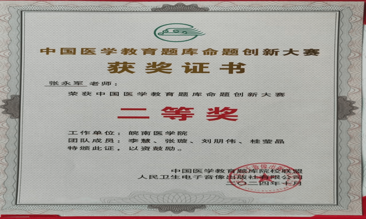 近日,由人民卫生出版社和中国医学教育题库院校联盟联合主办、中国医科大学承办的首届“中国医学教育题库命题创新大赛”在沈阳圆满落下帷幕。我校第一附属医院医学诊断学教研室张永军教学团队作为安徽省唯一一所医学院校教学团队进入决赛,并从众多医科大学激烈角逐过关斩将,最终取得大赛二等奖的佳绩。