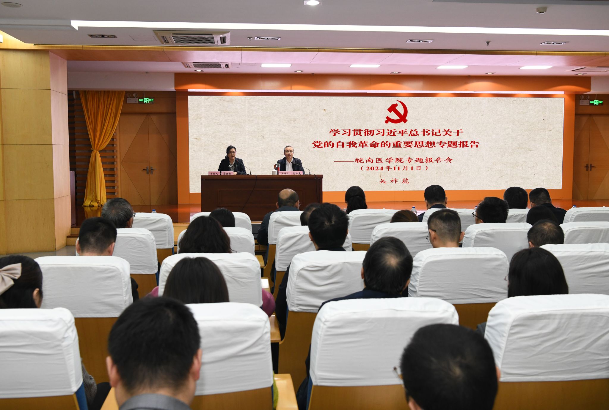 11月1日上午,学校在图书信息大楼学术报告厅召开“学习贯彻习近平总书记关于党的自我革命的重要思想”专题辅导报告会暨党委理论学习中心组学习(扩大)会议,邀请芜湖市委常委、市纪委书记、市监委主任吴祚麓作专题辅导报告。会议由校党委书记夏劲松主持,校党委常委姚应水、贾贤燕、文育锋、王保中、韩永升、陈晓宏、邹莹出席报告会。