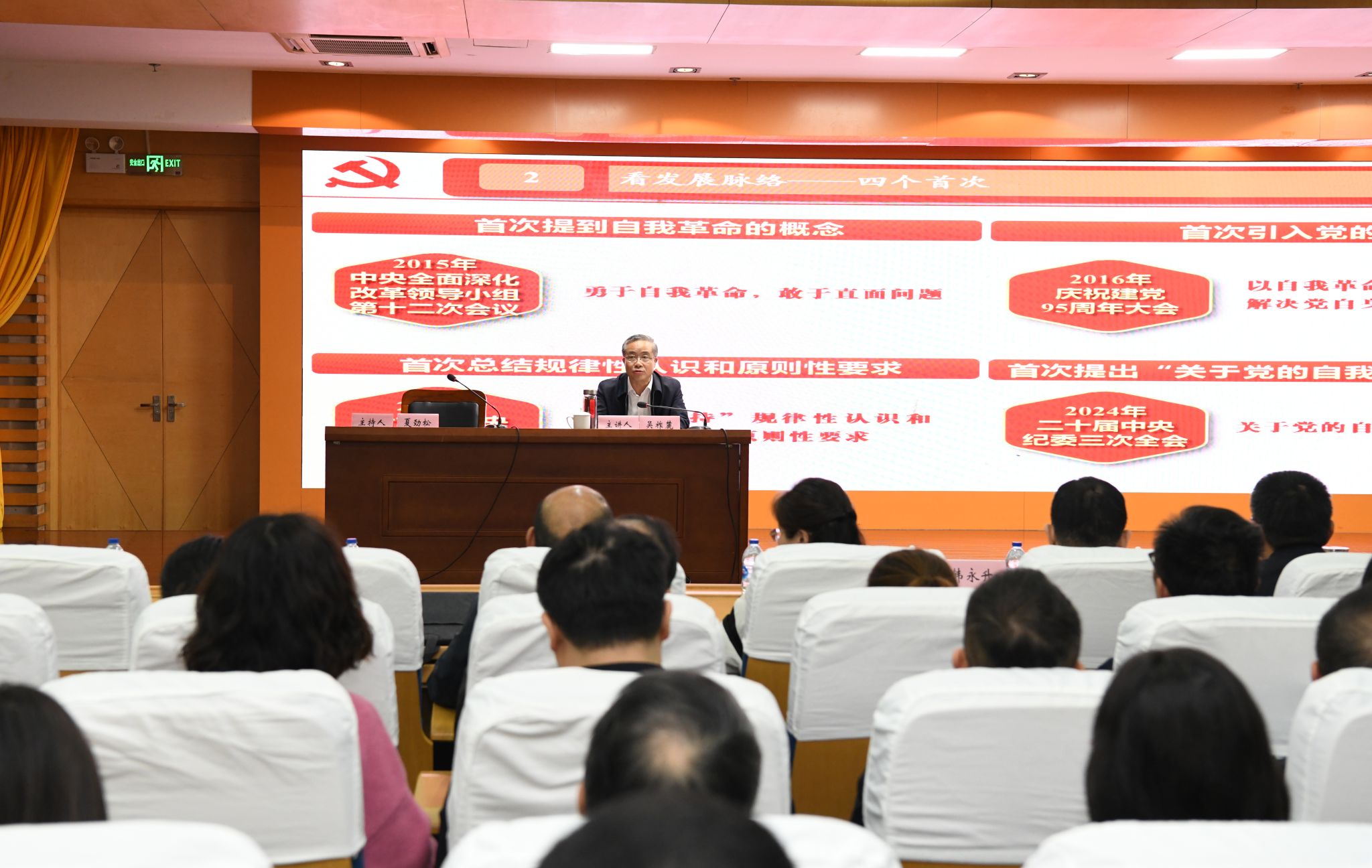 夏劲松强调,学校各二级党组织、各职能部门和广大党员干部要以此次专题辅导为契机,一要深刻把握党的自我革命的核心要义,站在忠诚践行“两个维护”的政治高度,进一步深学细悟习近平总书记关于党的自我革命的重要思想,压紧压实管党治党政治责任,全面增强推进党的自我革命的勇气和决心。二要深刻把握党的自我革命的实践要求,坚持问题导向,以接受巡视监督为契机,以系列专项整治为抓手,敢于发现问题、勇于直面问题、善于解决问题,切实解决全面从严治党向纵深发展中存在的实际问题,将推动问题解决的过程变为提升学校治理体系和治理水平的过程。三要始终保持自我革命的清醒坚定,用足用好警示教育,以“案中人”教育身边人、以身边事教育身边人,推动以案促改、以案说纪落到实处,常态长效净化党风政风、师德师风、医德医风、教风学风,确保将党的领导贯彻到办学治校的全过程,确保学校党建和事业发展稳步推进,确保学校始终沿着正确方向不断前行。