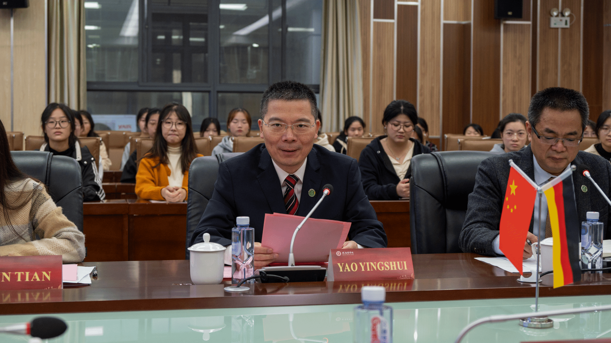 姚应水致欢迎辞,代表学校向德方嘉宾及各位参会人员表示热烈欢迎,并详细介绍了我校基本情况和护理学院发展历程。他表示“中德护理班”的开办,是学校积极响应国家教育对外开放战略的重要举措,也是优化学生培养模式的积极探索。希望同学们珍惜机会,不断提升综合素质,拓宽国际视野,牢记使命和责任,以精湛的护理技术和高尚的职业道德,为患者提供优质的护理服务,为中德医疗卫生领域合作贡献一份力量。