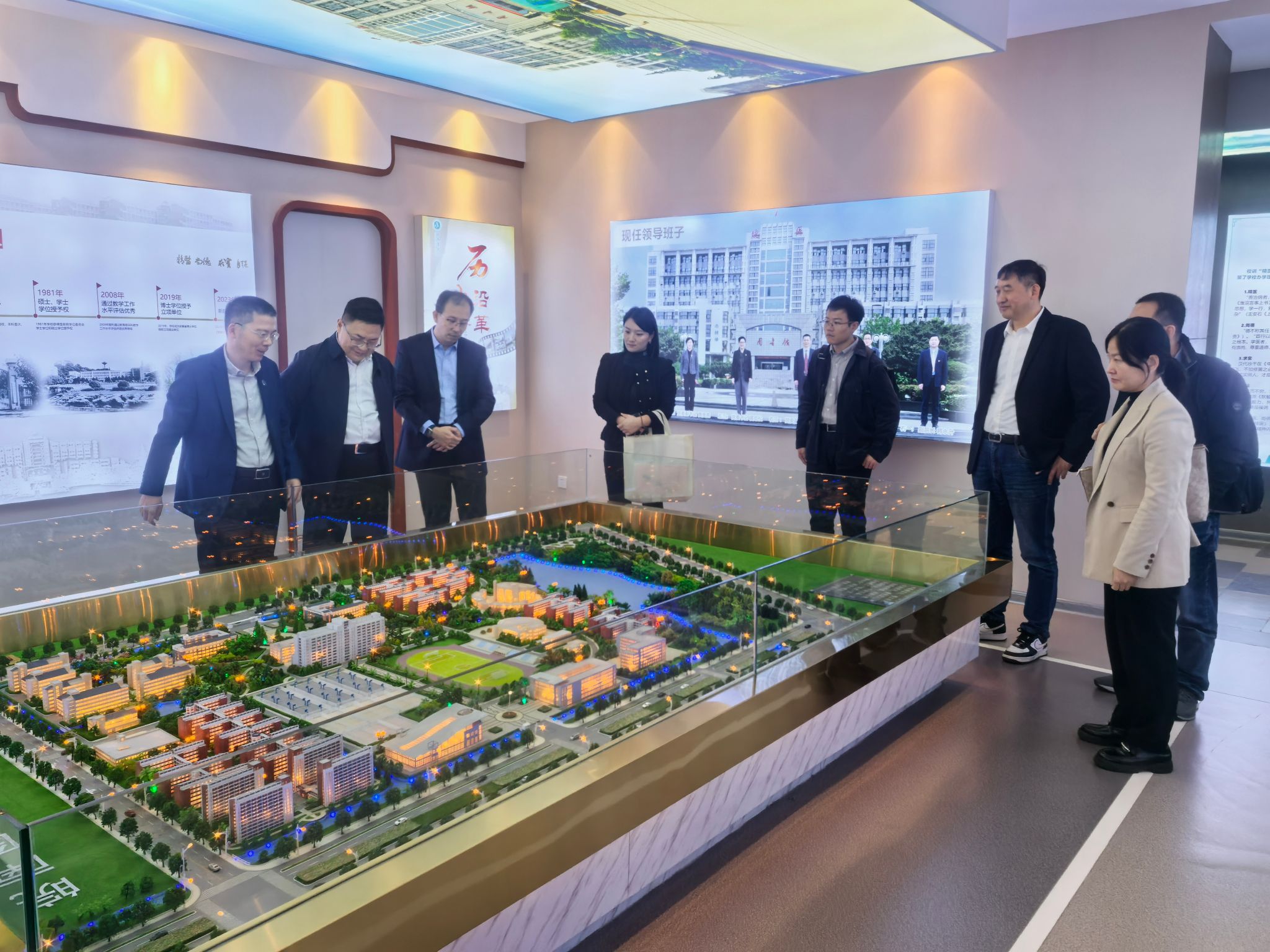 见面会后,朱双龙、刘辉一行参观了校史馆,并召开师生座谈会。