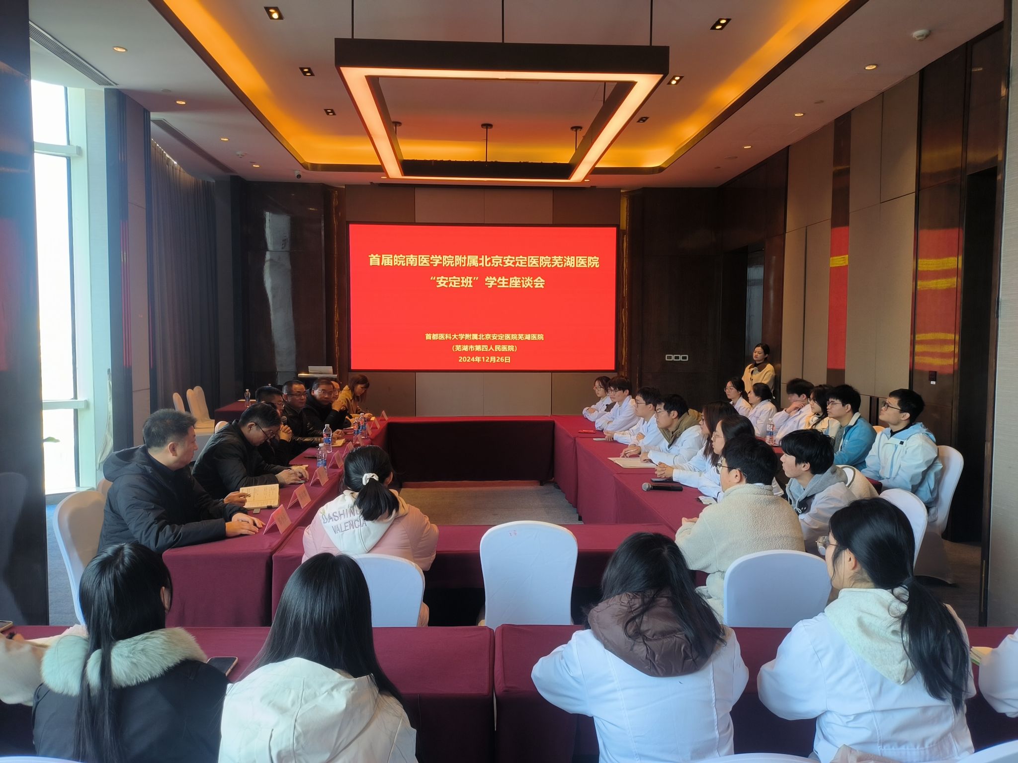 中午,学校联合芜湖市第四人民医院召开“安定班”师生座谈会。学校副院长文育锋,教务处、临床医学院相关人员,芜湖市第四人民医院党政领导,北京安定医院芜湖医院派驻院领导参加会议。会议邀请首都医科大学附属北京安定医院院长王刚为同学们答疑解惑。