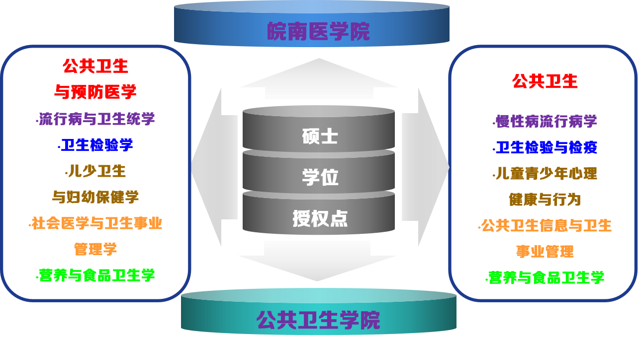 学院现有本科和研究生2个办学层次,拥有3个本科专业(预防医学[含专升本]、食品卫生与营养学、生物统计学),其中预防医学专业为省级“特色专业”、安徽省一流专业建设点。拥有公共卫生与预防医学一级学科硕士学位授予点、公共卫生专业硕士学位授予类别(MPH),其中公共卫生与预防医学学科为省级应用型高峰培育学科、校级一流学科。获批安徽省高水平公共卫生学院、高校公共卫生危机管理安徽省哲学社会科学重点实验室、省级公共卫生与预防医学教学团队、省级高校产学研联合培养研究生示范基地等。