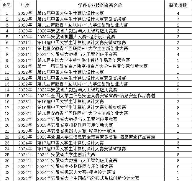 学院坚持“为党育人、为国育才”,促进学生德智体美劳全面发展。近五年,学院学子获得“中国青少年科技创新奖”“中国大学生自强之星”等国家级荣誉称号2人次,获学科专业技能竞赛国家级、省级奖项100余项。其中,学生获中国大学生计算机设计大赛省级以上奖项44个,包括国家级二等奖3项;获安徽省“互联网+”大学生创新创业大赛省级奖23个;获安徽省大数据与人工智能应用竞赛一等奖、二等奖、三等奖31个。