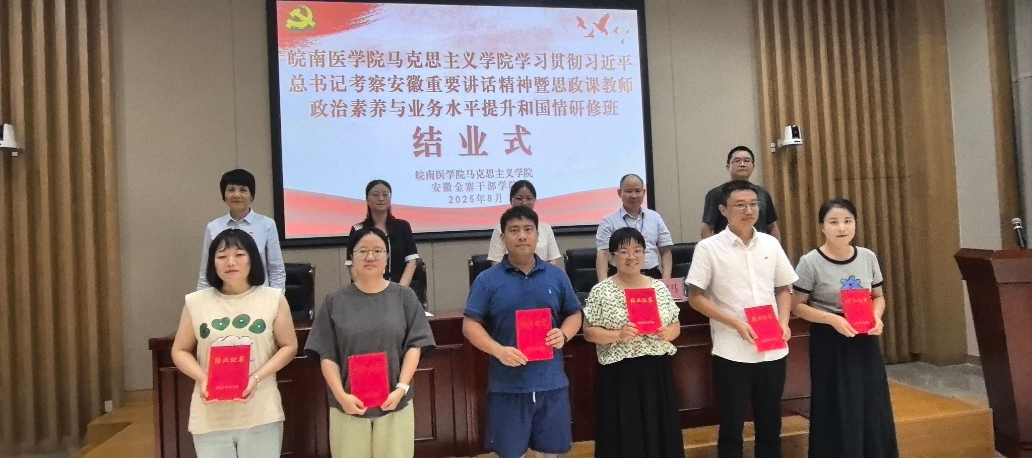 8月14日下午,研修班举行结业仪式,来自中国近现代史纲要教研室的王仓仓、思想道德与法治教研室的李海莉、马克思主义基本原理教研室的周伟义、习近平新时代中国特色社会主义思想概论教研室的吴垠、毛泽东思想和中国特色社会主义理论体系概论教研室的苗笛、形势与政策教研室的张瑜等6位老师作为学员代表发言,他们表示此次研修通过一系列沉浸式、体验式的教学安排,有效引导参研教师将理论学习、历史感悟、文化熏陶与时代观察有机融合,是一次深刻的思想洗礼和精神升华,今后定将所学所悟融入教学实践,转化为讲深讲透讲活思政课的现实成果,努力培养担当民族复兴重任的高素质医学人才。马克思主义学院副院长张婧对安徽金寨干部学院的精心组织和周到安排表示感谢,并对全体教师提出思想再解放、能力再提升、责任再压实的三点要求,表示将以此次研修为新起点,凝心聚力推动马克思主义学院高质量发展。(吴银银/文、图)