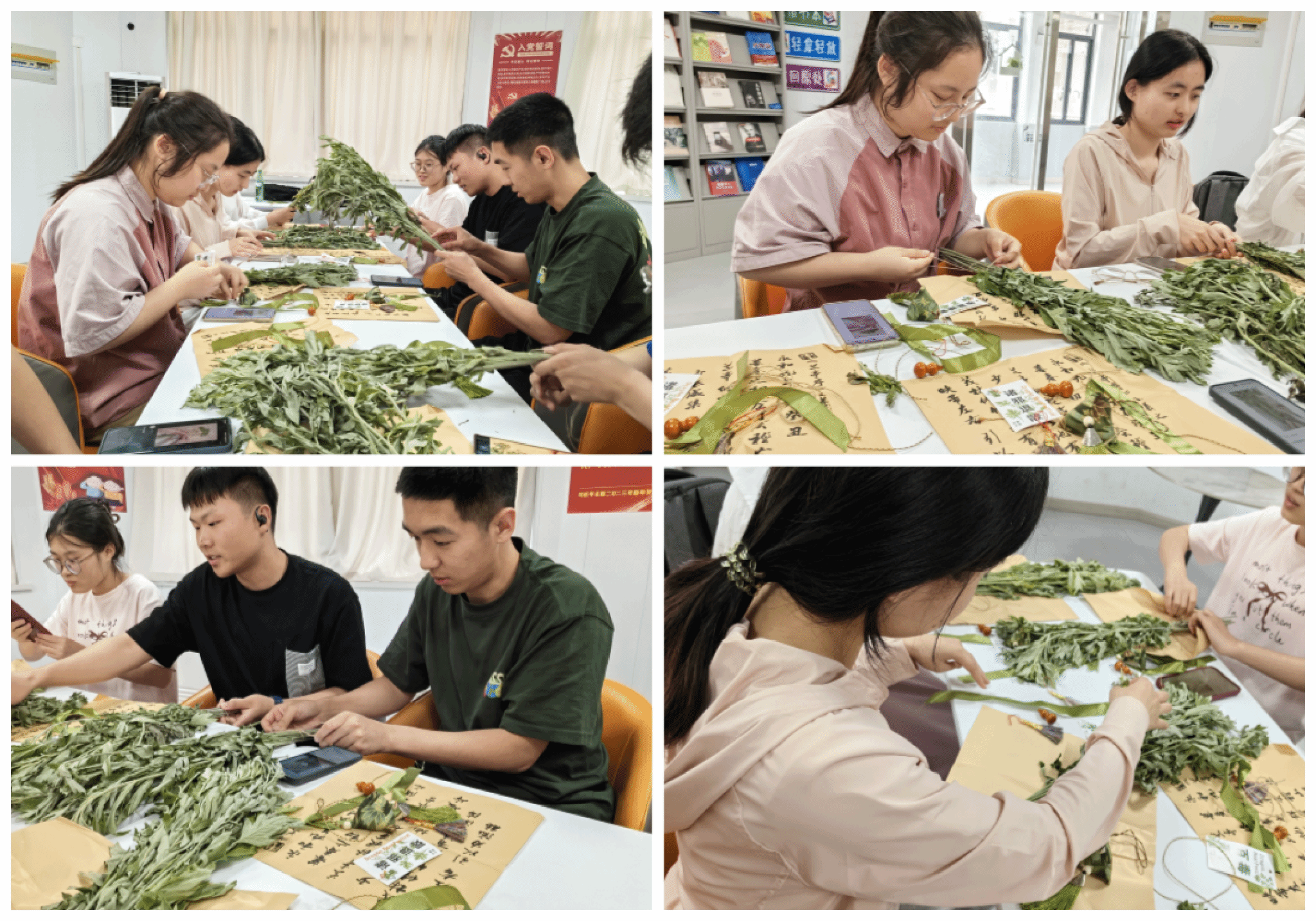 “清明插柳,端午插艾。” 艾草在端午节有特殊的寓意,承载着古人对健康、平安的美好期许。5月30日,社区开展端午艾草花束DIY制作活动。活动中,同学们纷纷动手,精心挑选艾草枝叶,巧妙搭配色彩,用心缠绕丝带,再点缀上小巧的香囊、五彩的葫芦等装饰。在制作过程中,大家互相交流、互相帮助。同学们表示:“自己做的艾草花束比买的更有意义,不仅保留了传统意义,还能装点生活。”制作完成后,同学们将这些艾草花束装点在寝室门前,赠予师长、同学,这不仅延续了驱虫避瘟的传统寓意,更彰显着医学生 “悬壶济世” 的职业担当。