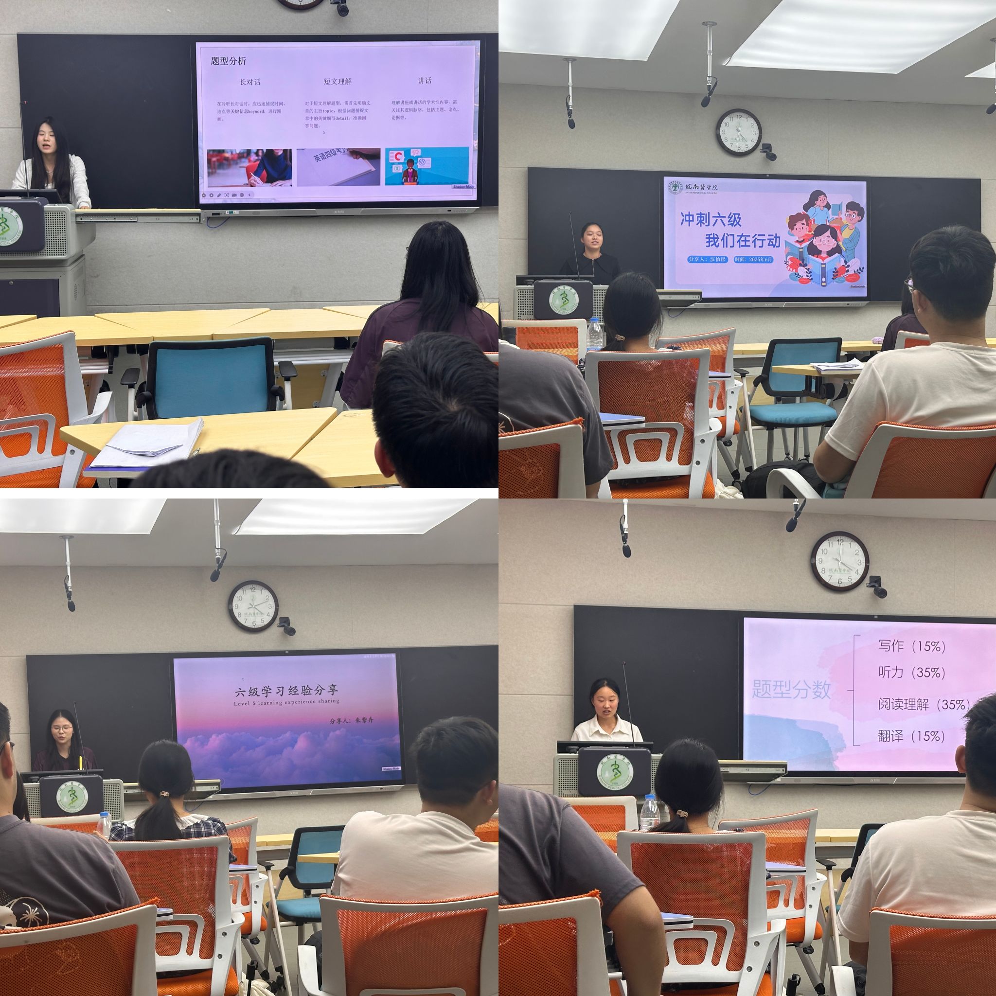 为帮助同学们更好地备战即将到来的英语六级考试,6月3日下午,麻醉学院“一站式”学生社区联合学院党委学生第一党支部在北区1106智慧教室组织开展了英语六级冲刺备考经验交流会。本次活动邀请四位英语六级考试成绩530分以上的学生代表分享备考经验和学习方法,吸引了众多同学积极参与。