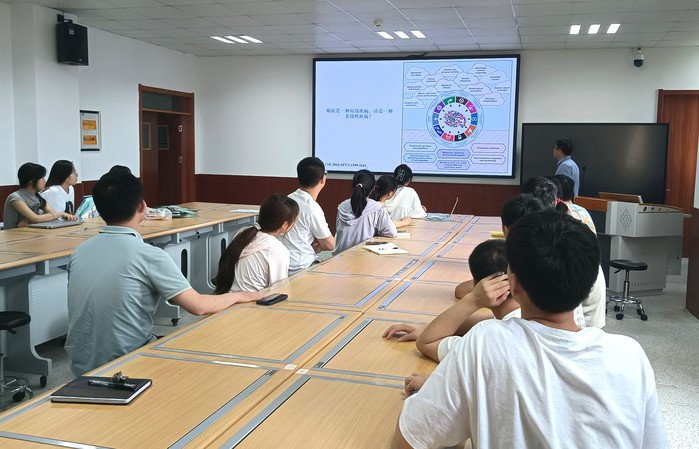 朱鹏博士以“肿瘤微环境响应型超分子纳米体系的构建及其多模式协同抗肿瘤研究”为主题作学术报告。讲座中,朱鹏博士详细介绍了肿瘤微环境在肿瘤形成过程中发挥的作用、肿瘤的治疗现状与挑战等相关研究进展,从多个层次分享了肿瘤氧化还原、GSH、缺氧/偶氮还原酶等不同肿瘤微环境响应的超分子纳米体系的构建及其应用等方面的工作,并简单分享了在小分子靶向抗肿瘤药物和基于新型荧光探针的诊疗剂等研究方向的工作进展及其临床应用探索。报告结束后,朱鹏博士和与会师生在论坛主题相关内容、科研方向的选择、科研工作的开展、团队协作等方面进行了深入探讨。整场论坛内容丰富生动,引人入胜,交流深入,给与会者留下了深刻印象,效果显著。
