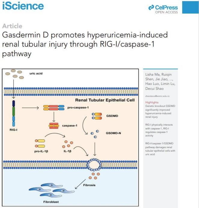 近期,人文与管理学院生理学与神经生物学教研室邵德翠科研团队的研究成果《Gasdermin D promotes hyperuricemia-induced renal tubular injury throughRIG-I/caspase-1 pathway》在SCI中科院二区杂志《iScience》(IF:5.8)在线发表,创意揭示高尿酸血症诱导肾小管损伤的新机制。