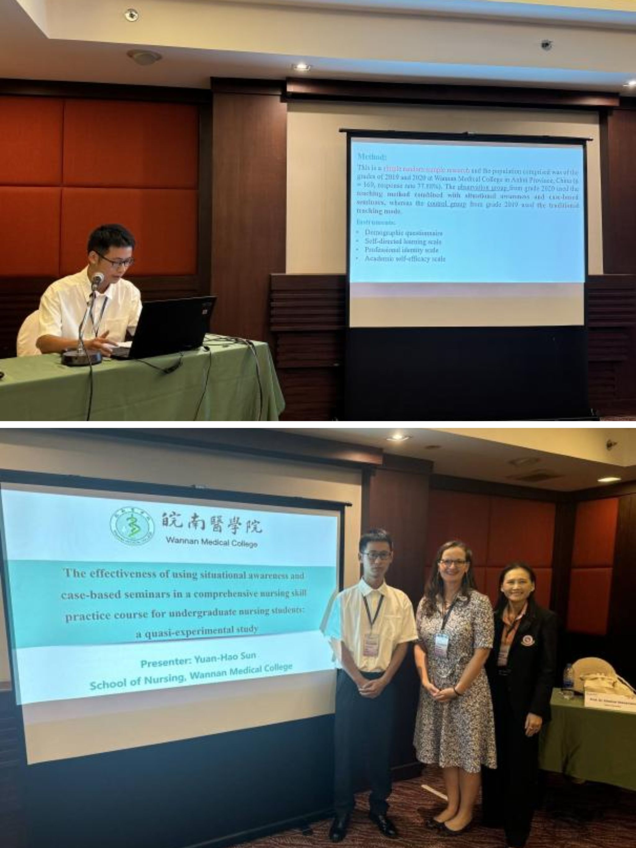 孙源豪围绕“情境感知与案例研讨相结合的教学方法在护生综合护理技能实践课程中的效果”,进行口头报告“The effectiveness of using situational awareness and case-based seminars in a comprehensive nursing skill practice course for undergraduate nursing students: a quasi-experimental study”。