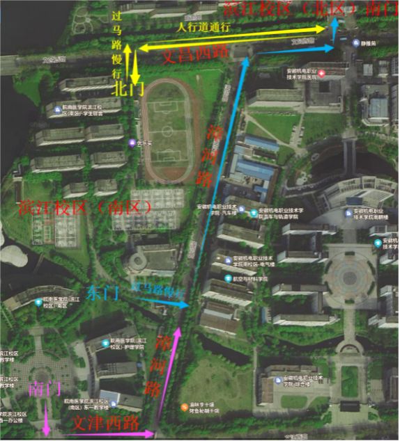 路线2:出滨江校区(南区)东门的师生→通过漳河路人行横道→漳河路东侧道路→漳河路与文昌西路交叉路口右转→安徽机电职业技术学院北门→滨江校区(北区)南门。(图中蓝色路线)