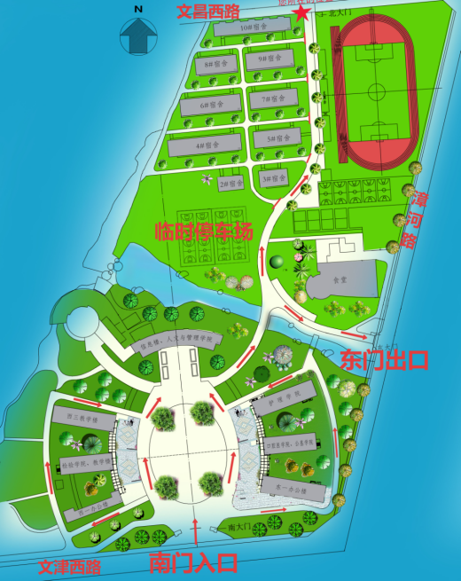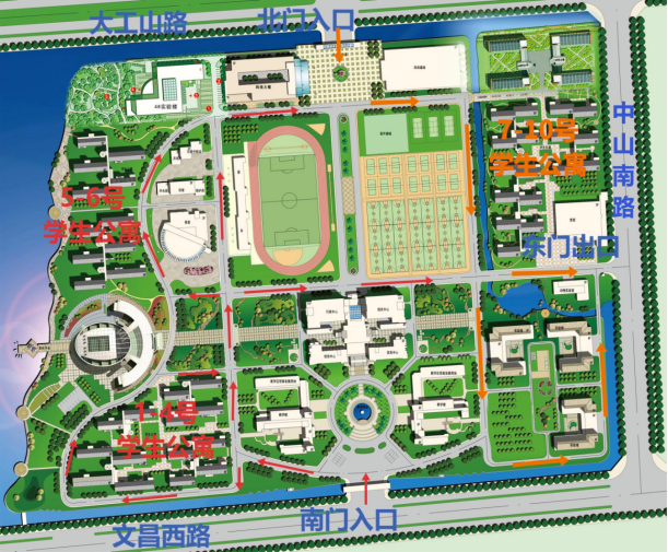 1.接送新生及其家长的大巴车辆、新生家长私家车、乘坐出租车来校的新生从南门和北门进校。按照校内交通标识指引(附图一),车辆行驶至合欢路从东门离校。